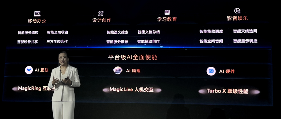 在人机交互层面,荣耀平台级AI构筑基于人的关联因子计算模式新内核,通过感知学习、意图理解、自然交互,了解用户的行为规律、个人信息、兴趣偏好等,构建AI时代全新的PC交互模式。