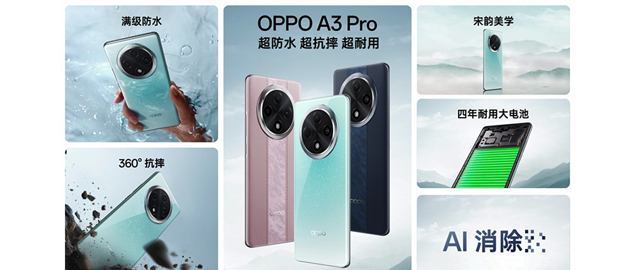 智东西4月12日消息,刚刚OPPO发布了A系列中端机新品OPPO A3 Pro,其核心提升了抗摔、防水两方面的能力,搭载了OPPO晶盾玻璃,支持IP69、IP68、IP66防水,在同价位段产品中,这是比较少见的。