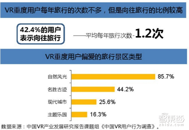 9.VR重度用户平均每年旅行次数仅为1.2次,但是,“宅”生活并不能阻挡他们对旅行的向往,42.4%的VR重度用户都表示自己向往旅行,这也催生了他们对VR设备上旅游景匙相关内容的关注。他们偏爱的旅行场所,首选自然风光,占比为85.7%;其次是名胜古迹,占比为44.2%。