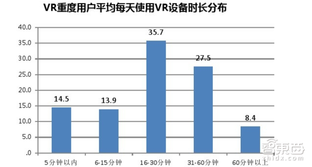 6.中国VR重度用户每天使用VR设备的时间主要集中在16分钟-60分钟,平均每天使用时间是34分钟,VR已经成为重度用户娱乐生活的重要组成部分。