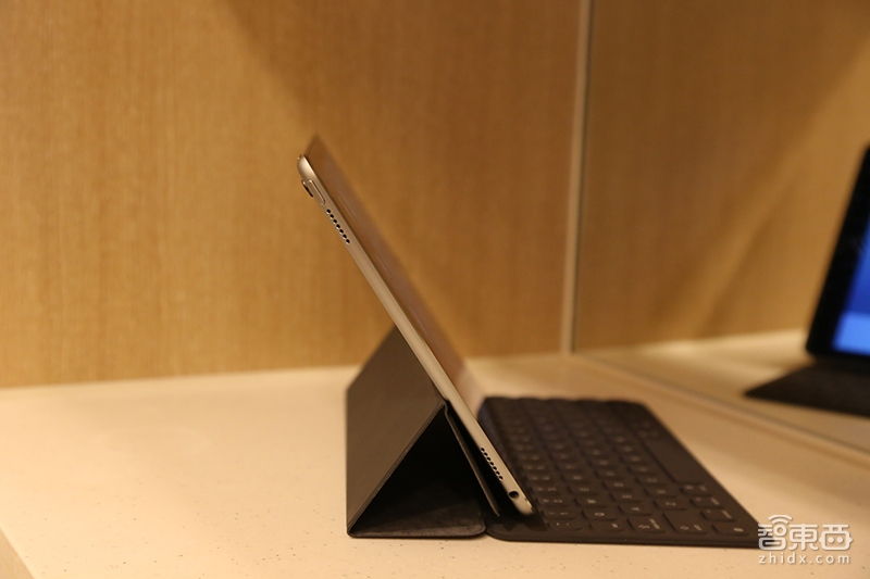 iPad Pro 9.7英尺版也同样有类似感受,和9.7英尺的iPad Air2看似外形一致,但是屏幕色彩表现比iPad Air强,使用1200万像素模组后,摄像头位置也有一定凸起。但相比12.9英尺的iPad Pro,则有很多明显的差异,比如新适配的保护套一体键盘,键盘尺寸进行了等比缩小,打字时,自然十个指头会明显感觉挤了,但手感和表面的纹理质感还是非常不错。