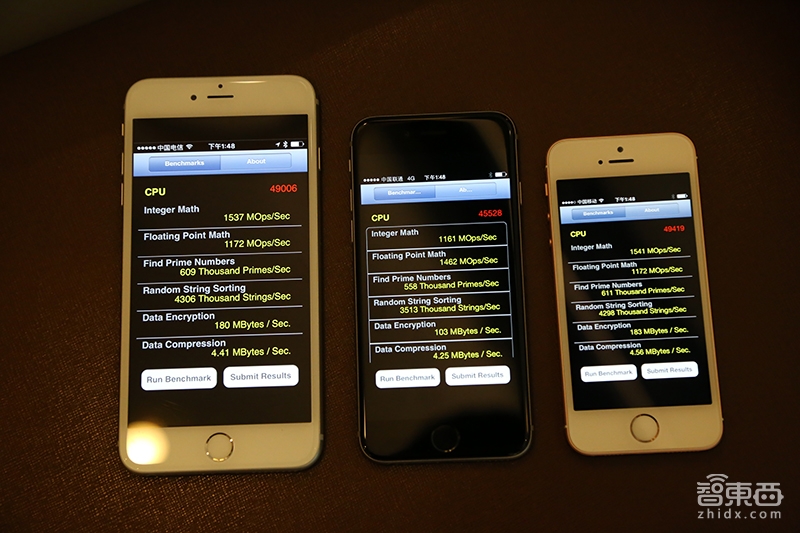 通过BenchMark软件的简单跑分测试,跑分过程中,iPhone SE明显比iPhone 6进度更快,结果数字iPhone SE甚至高过iPhone 6s Plus,其中一个很重要的原因应该是iPhone SE的屏幕分辨率更小,更少消耗GPU资源。