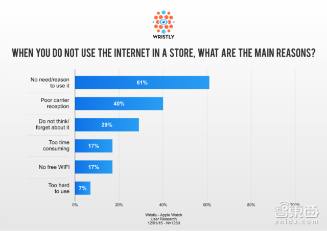 原因有很多,但是61%的用户都天然呆的反问“上街血拼时,干嘛要用手机/手表呢?”基本上可以看出超过一半的用户并没有建立起这种习惯。另外一个举足轻重的原因就是商场内糟糕的网络连接体验,40%的用户都在这个问题上想要吐槽。另有29%的用户表示“一逛街就把智能设备抛在脑后了”。