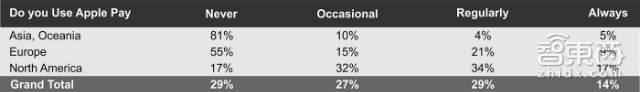 经常使用Apple Pay的还是北美用户,欧洲其次,亚洲最少。北美用户的51%表示“经常”或“总是”使用Apple Pay,从不使用的仅有17%。