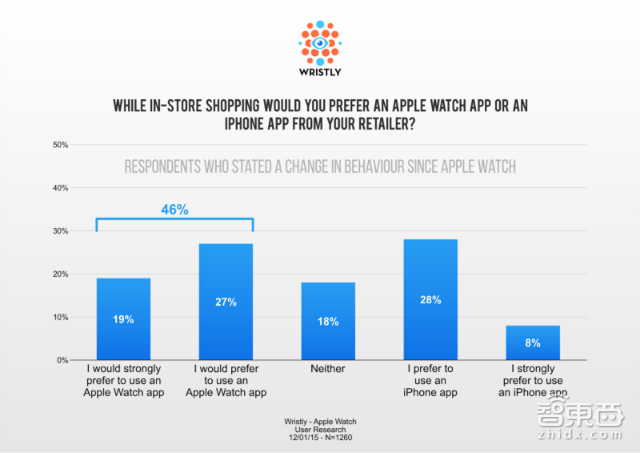 在室内购物时,你倾向于使用Apple Watch的APP还是iPhone的APP?选择Apple Watch的用户比选择iPhone的用户多了10个百分点,当然还有18%的人表示无所谓。