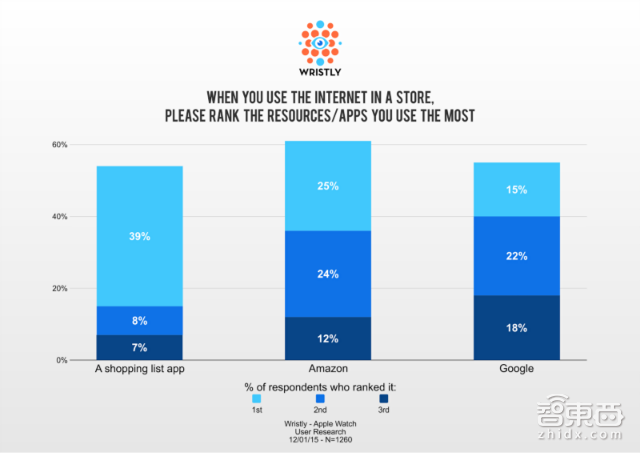 再来关注一下用户在实体店购物时最常使用的APP是什么?调查表明最受青睐的APP是购物清单类,亚马逊和Google。至于零售商开发的APP和其他第三方APP都还排不上号。