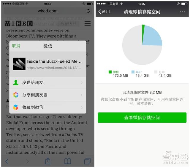 (左:直接从Safari浏览器中分享内容到微信;右:清理微信缓存)