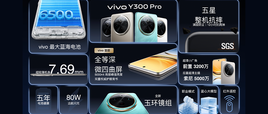 智东西9月5日报道,刚刚vivo正式发布了vivo Y300 Pro智能手机新品,其搭载了vivo史上容量最大的6500mAh蓝海电池、vivo首款全等深微四曲屏等多项首发技术。