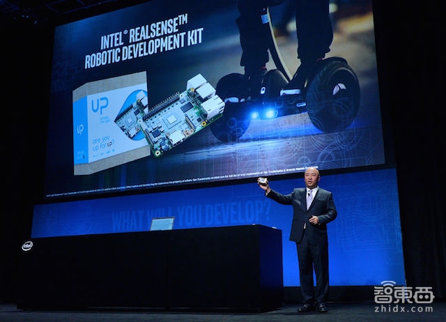 2、随后,Ninebot机器人业务部副总裁蒲立骑着赛格威(Segway)平衡机器人代步车出场,Segway内置有英特尔凌动处理器和英特尔实感技术摄像头,不仅可作为智能代步出行工具,也可变身机器人管家与用户直接对话。