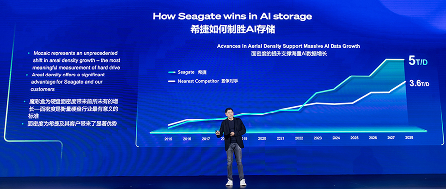 面密度是衡量硬盘行业最有意义的标准,其提升能在有限空间内实现更大的存储容量,对于经济高效地扩展海量存储容量至关重要。而希捷在这方面具备显著优势,其已在实验室实现单碟片面密度超过5TB,有能力支撑海量AI数据增长。