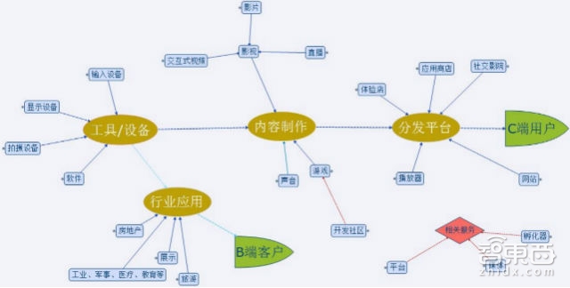 报告指出,虚拟现实产业链长,产业带动比高,涉及产业众多,包括虚拟现实工具与设备、内容制作、分发平台、行业应用和相关服务等在军事、民用以及科研等方面的各种应用。