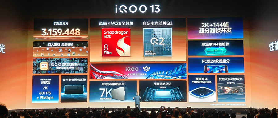 在软件层面,vivo自研的蓝晶芯片技术栈此次也应用在了iQOO 13系列中,该技术栈包含了vivo和高通对CPU、GPU的联合调优,重点投入了调度、显示和存储三个领域。基于帧率感知引擎,据称iQOO 13的调度响应速度提升了100%。