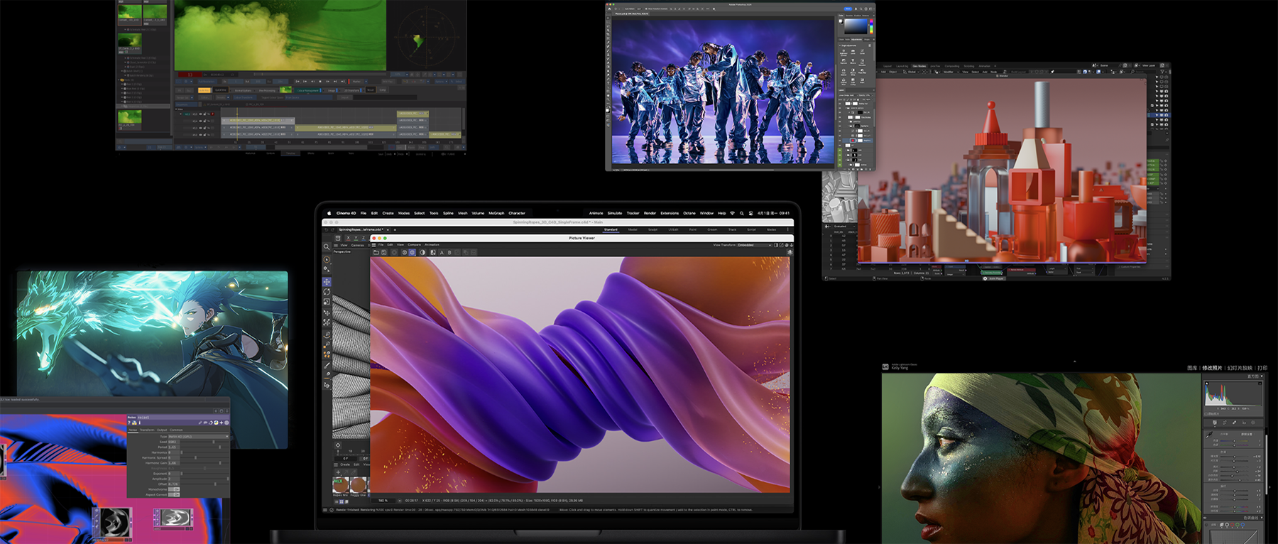 - 使用Maxon Redshift进行场景渲染速度,比搭载Core i9处理器的16英寸MacBook Pro提升最多可达7.8倍,相比搭载M1 Max芯片的16英寸MacBook Pro提升最多可达3.5倍。