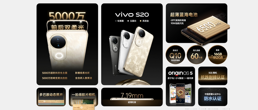 vivo S20 Pro搭载了前后5000万像素四主摄,蓝晶×天玑9300+旗舰芯、京东方Q10屏和公里级无网通信等特性向旗舰看齐。vivo S20厚度仅有7.19mm,但电池容量达到了6500mAh。vivo S20 Pro采用了旗舰同款全等深微四曲屏。