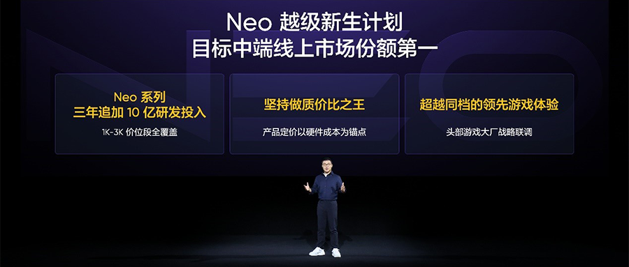 徐起说,Neo系列目标冲击中端线上市场份额第一,为此真我会对Neo系列三年追加10亿研发资金,推出1000-2000元价位段新品,实现1000-3000元价位段全覆盖。在定价上,质价比依然是真我要坚持的,产品锚定综合硬件成本价。