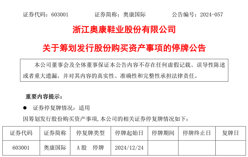 因交易尚处于筹划阶段,尚存在不确定性,经公司向上海证券交易所申请,奥康国际股票(证券代码:603001)自2024年12月24日开市起停牌,预计连续停牌时间不超过10个交易日。