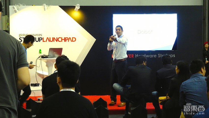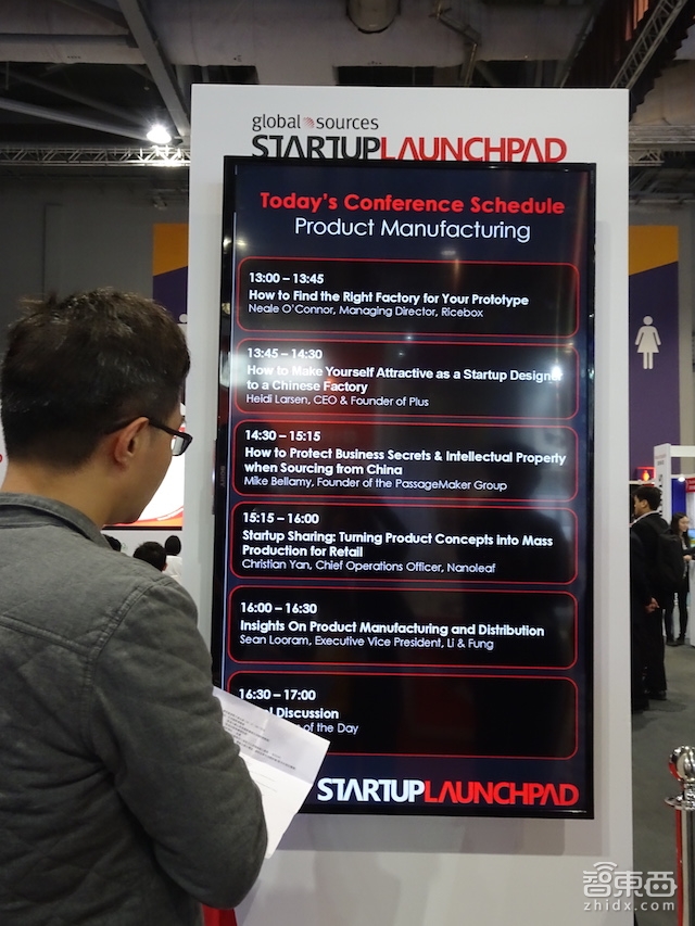 在产品展区的另一端是环球资源为各大参展者提供的创业信息交流沟通平台,通过指示牌可以了解当天的演示嘉宾与主题安排。