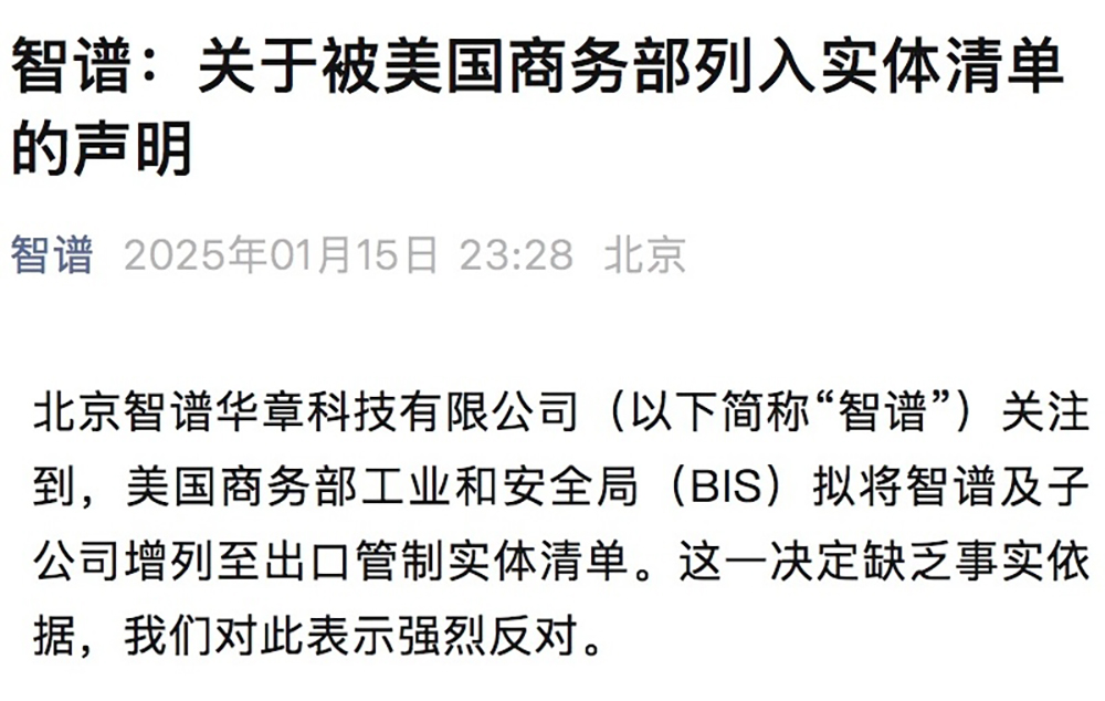 智谱已发声明回应,认为“这一决定缺乏事实依据”,并称“鉴于智谱掌握全链路大模型核心技术的事实,被列入实体清单不会对公司业务产生实质影响”。