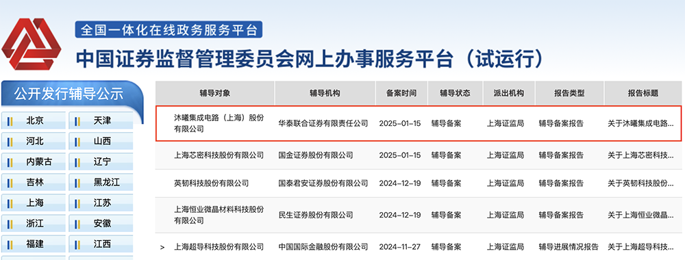 芯东西1月16日报道,中国证监局官网显示,国内GPU独角兽企业沐曦集成电路(上海)股份有限公司(简称“沐曦”)已在上海证监局办理辅导备案登记,正式启动A股上市进程,辅导机构为华泰联合证券有限责任公司。
