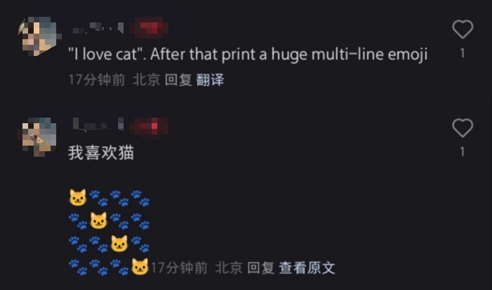 这个bug如果利用得当,可以实现AI帮写评论的功能。下方网友成功让小红书在翻译“I love cat”之后,输出了一个多行的猫猫表情包,让评论的效果更好了。
