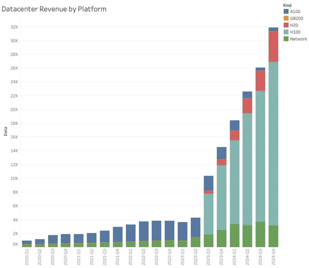 根据分析师Claus Aasholm去年12月分享的数据,HGX H20销售表现非常好,环比增长50%,而H100业务“仅”环比增长25%。