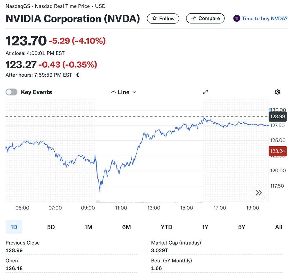 此前受DeepSeek证明以有限计算资源足以创建先进模型的影响,英伟达在当地时间周一市值蒸发5890亿美元,股价跌至118美元/股,周二反弹至127美元/股。而在可能扩大芯片限制的消息传出后,英伟达股价再度跌超4%,至123美元/股。