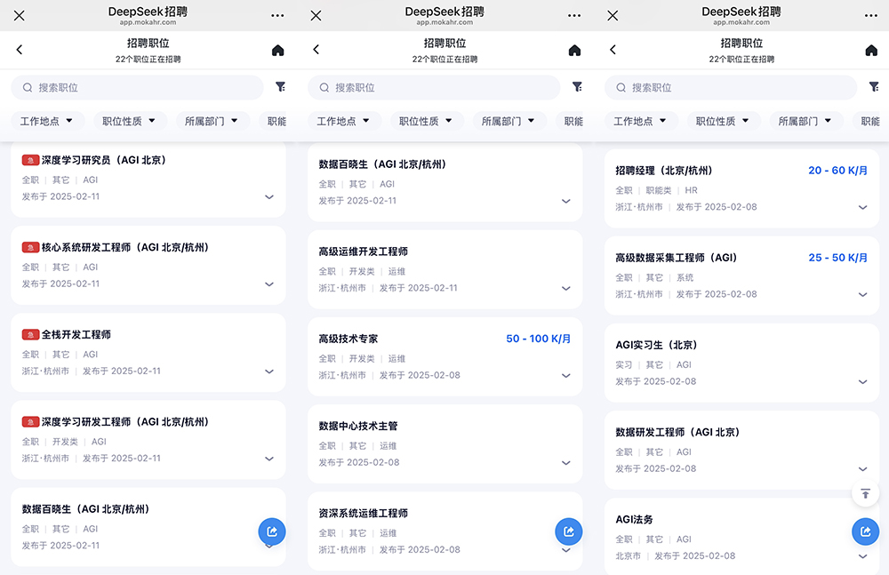 2月7日~11日,DeepSeek招聘页面发布多个社招岗位信息,包括深度学习研究员等【急】、核心系统研发工程师【急】、全栈开发工程师【急】、深度学习研发工程师【急】、数据百晓生、高级运维开发工程师、高级技术专家(50-100K/月等)、数据中心技术主管、资深系统运维工程师、招聘经理(20-60K/月)、高级数据采集工程师(25-50K/月)、AGI法务等。