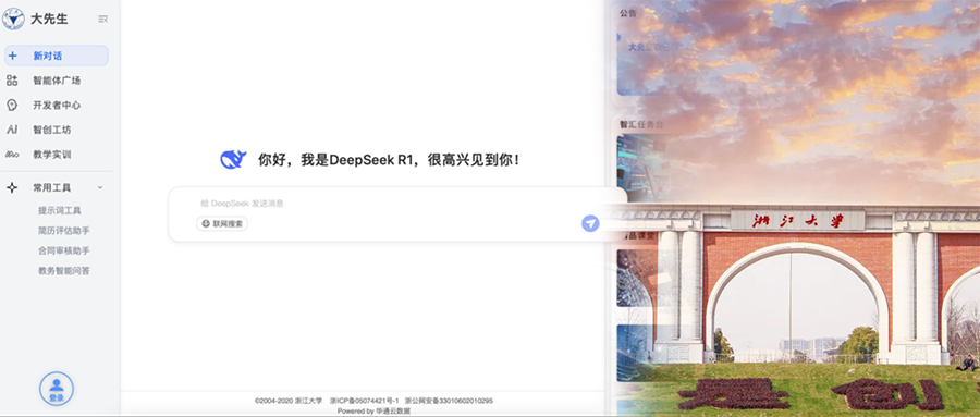 2、全国829所高校师生免费使用:通过CARSI联盟,全国829所高校的师生可以直接登录chat.zju.edu.cn,免费使用DeepSeek V3/R1模型及其它智能体应用,彻底打破校园IP限制。2月20日起,该入口将正式开放。