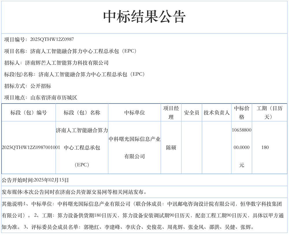 智东西2月19日报道,2月15日,全国公共资源交易平台济南公共资源交易中心网站发布中标结果公告,位于山东省济南市历城区的招标项目济南人工智能融合算力中心工程总承包(EPC),由中科曙光国际信息产业有限公司中标,中标价格为10亿6588万元,工期为180天。
