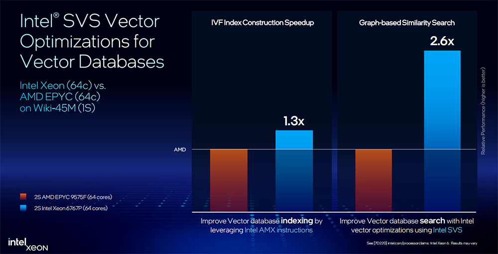 得益于AMX加速引擎,在同等核心数下,至强6在矢量数据库离线构建索引表的过程中,性能甚至可以高过竞品30%。在线上搜索过程中,英特尔还有软件加持,即专门针对大规模矢量数据库的索引创新Scalable Vector Search(SVS),充分利用了英特尔CPU的硬件特性,相比竞品,性能可提升到2.6倍。