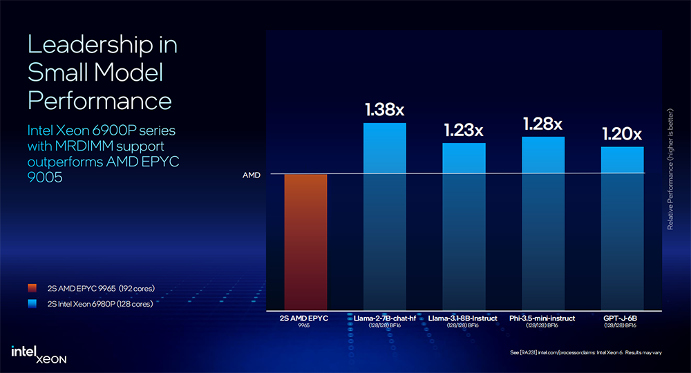 小规模的大语言模型在推理过程中对内存带宽需求高。至强6是首款支持MRDIMM的平台,能够为带宽敏感的中小模型推理任务提供更好的性价比。128核的至强6980P结合MRDIMM技术,在运行轻量级大语言模型时的推理性能比192核AMD EPYC 9755高出20%~38%。