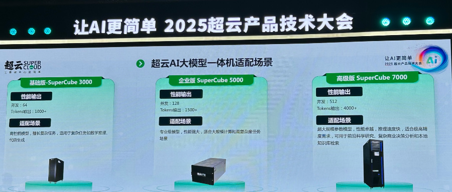 智东西2月28日报道,今天在主题为让AI更简单的2025超云产品技术大会上,北京智算产品及服务供应商超云正式发布了最新的超云AI大模型一体机系列,共有6款产品,分别为信创版和国际版的SuperCube 3000基础版、SuperCube 5000企业版以及SuperCube 7000高级版一体机。