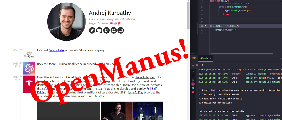 根据项目放出的实测视频,Open Manus能浏览多个网页,查询、整理信息,并生成特定格式的文件。案例中,Open Manus根据用户提示词,自动打开了AI大牛Andrej Karpathy的个人主页,针对这一网页提出了搜索引擎优化的详细建议。