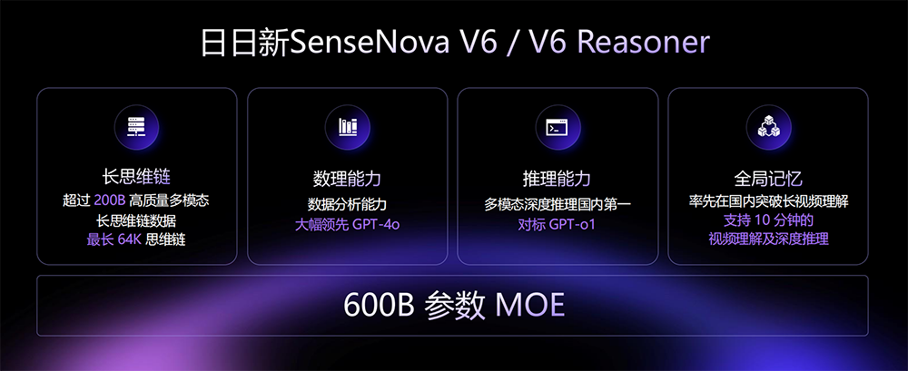 新发布的「日日新SenseNova V6」原生多模态通用大模型,采用混合专家架构(MoE),拥有6000亿参数,做到三合一:多模态长思维链+多模态强化学习+多模态全局记忆。