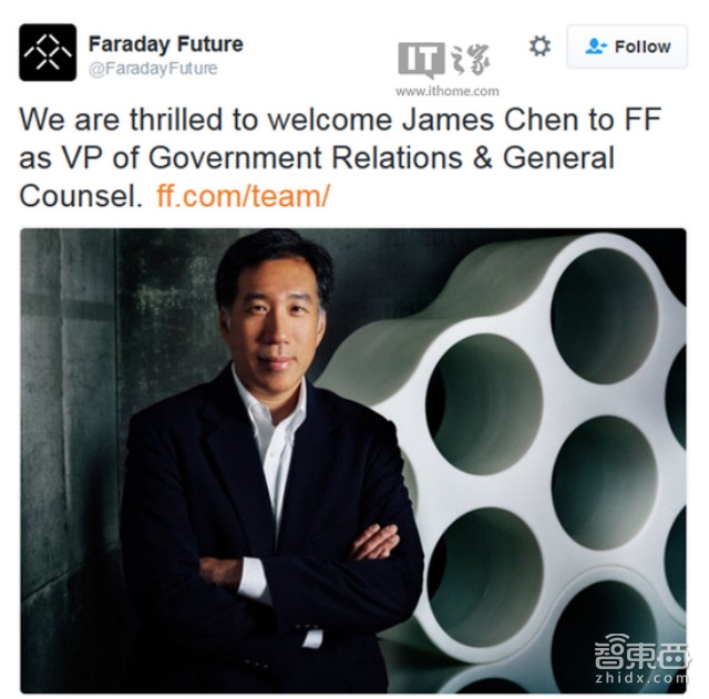 根据国外媒体报道,特斯拉政府监管事务副总裁兼副总法律顾问詹姆斯·陈(James Chen)已经离开公司,加盟互联网电动车初创公司Faraday Future(简称FF,也就是法拉第未来)。而Faraday Future我们已经熟悉,其背后的支持方式来自中国的乐视CEO贾跃亭。Faraday Future官方已经确认了这一消息,并表示詹姆斯·陈将出任该公司政府关系总裁兼法律总顾问,负责电动车生产和“国内及国际政府事务的各个方面。”