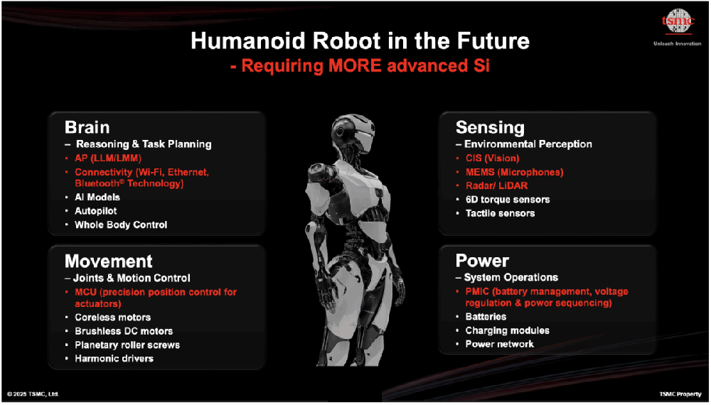 台积电还晒出一张人形机器人图,标注了所需的各种先进芯片。将这些芯片集成到高密度、高能效的封装中的能力至关重要。