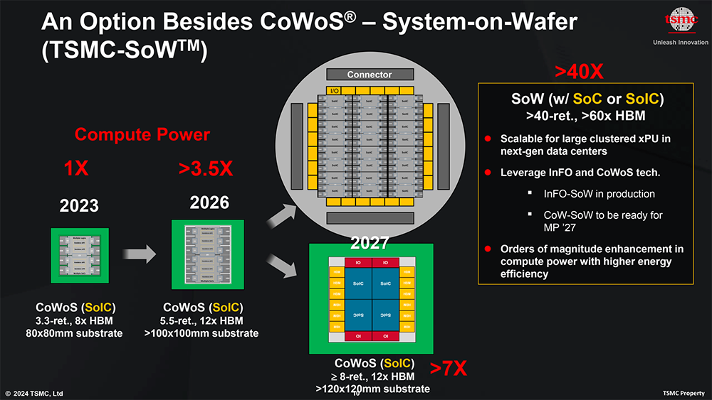 继2024年展示其晶圆上系统(TSMC-SoW)技术后,台积电又推出了基于CoWoS的产品SoW-X,旨在创建一个晶圆大小的系统,其计算能力是现有CoWoS解决方案的40倍。量产计划于2027年实现。