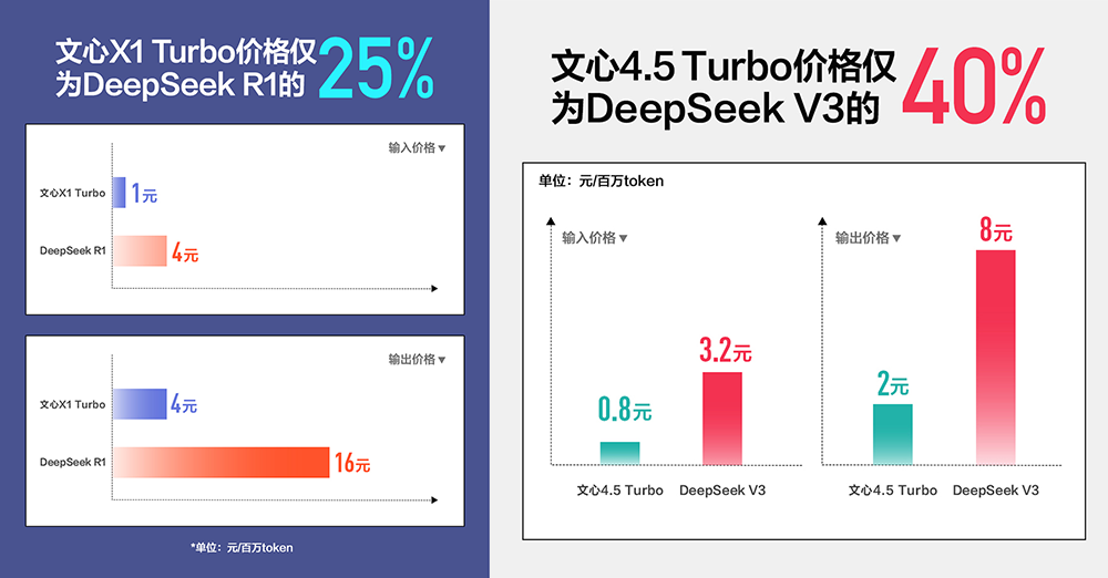 文心大模型X1 Turbo,输入价格为每百万token 1元,输出价格4元,相比文心X1,性能提升的同时价格再降50%,仅为DeepSeek-R1的25%。