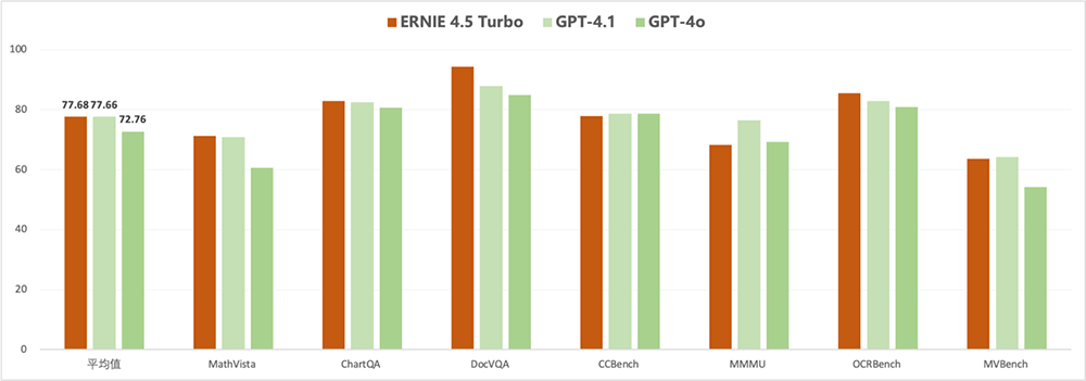 在多个基准测试集中,文心4.5 Turbo多模态能力与GPT-4.1持平、优于GPT-4o。