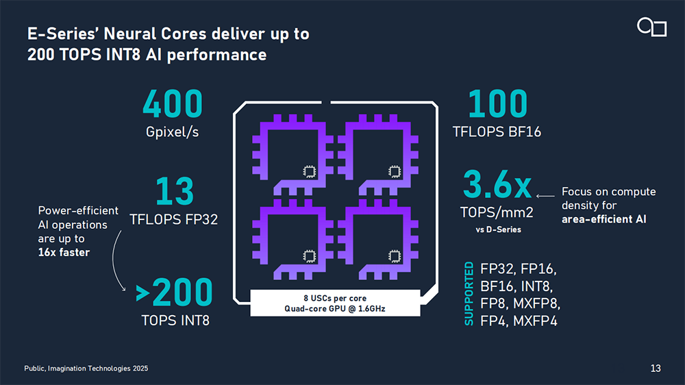 Imagination E系列GPU IP的每个GPU核深度集成低精度、高能效AI加速能力。小核在1GHz频率下有8Gpixel/s的像素填充率、0.25TFLOPS浮点算力、2TOPS INT8算力,可满足轻量级应用需求。4核配置在1.6GHz频率下可提供400Gpixel/s的像素填充率、12.8TFLOPS浮点算力(FP32)、超过200TOPS的INT8算力。