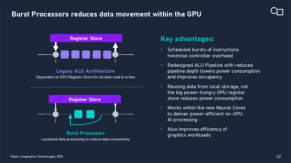 Imagination的PowerVR GPU架构以能效著称,已在功耗受限设备中应用近二十年。E系列进一步引入全新的爆发式处理器(Burst Processors) 技术,在AI推理、游戏和用户界面等工作负载下平均功耗效率再提升35%。