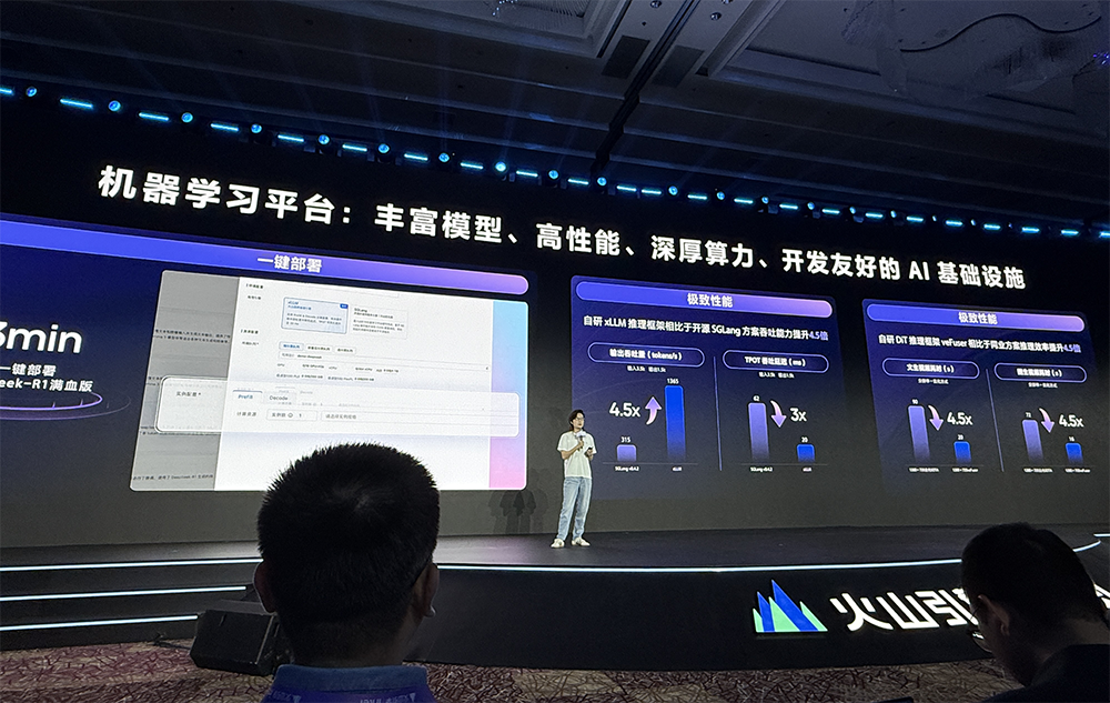 火山方舟机器学习平台突破了传统部署的复杂流程,通过预置模型和镜像以及PD分离部署方式,仅需1- 3分钟即可一键启动预置模型服务,完成DeepSeek推理集群的部署。