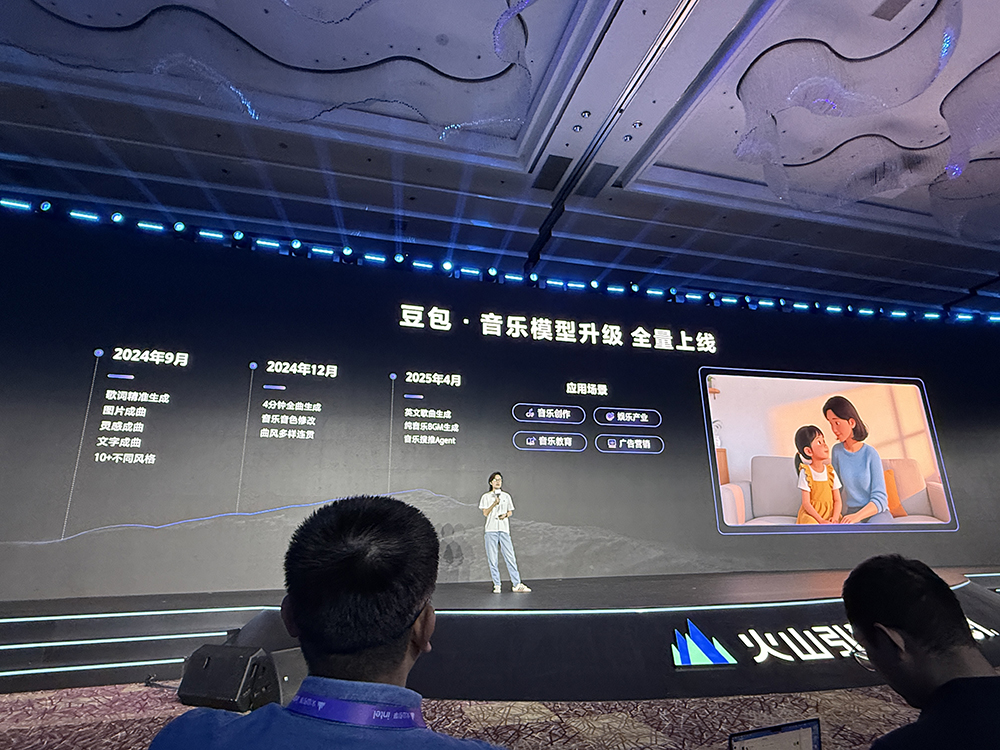 去年,火山引擎推出了豆包·音乐模型。基于该模型,用户仅通过一张图、一句话,就能创作10多种不同风格的高品质音乐。此次大会上,豆包·音乐模型升级,不仅支持英文歌曲创作,还可以通过理解视频,自动适配纯音乐BGM。