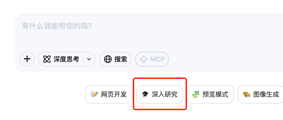 进入网站后,用户点击聊天框下的“深入研究”按钮,就可以体验深度研究服务了。注意需要保持“深度思考”和“搜索”两个按钮是关闭的,否则看不到“深入研究”按钮。