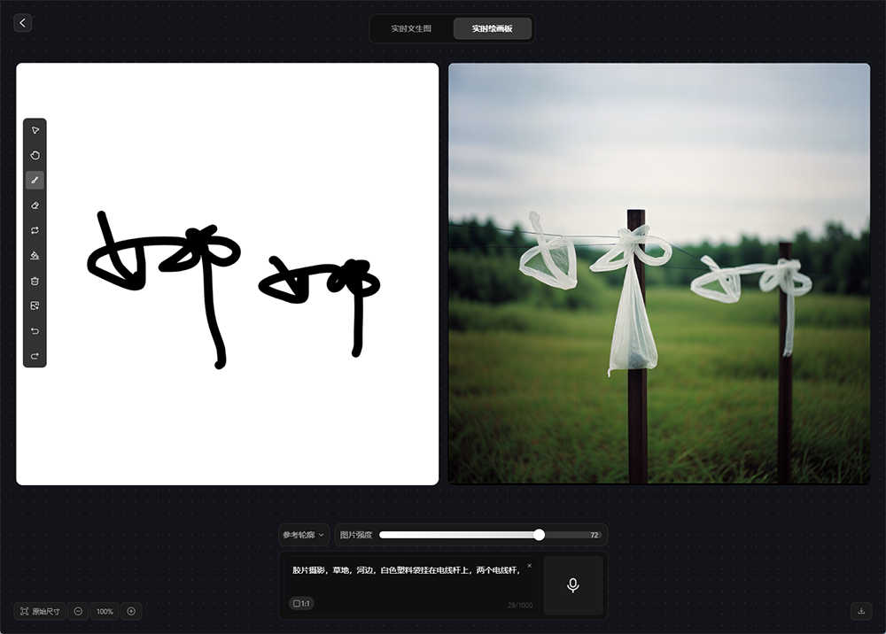 实时绘画板支持多图融合。用户上传多图后,可将多个草图叠加至同一画布自由创作,经过AI 自动协调透视与光影,按照提示词内容生成融合图像,进一步丰富了AI生图的交互体验。