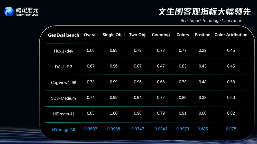 在图像生成领域专门测试模型复杂文本指令理解与生成能力的评估基准GenEval(Geneval Bench)上,腾讯混元图像2.0模型准确率超过95%,远超其他同类模型。