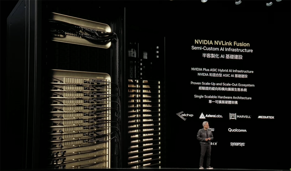 一大重磅发布是NVLink Fusion半定制AI基础设施,向外部芯片敞开了允许接入英伟达NVLink机架式系统的大门。这意味着构建AI系统,不必全用英伟达的芯片产品,而是可以搭配使用其他企业的定制CPU和AI芯片。