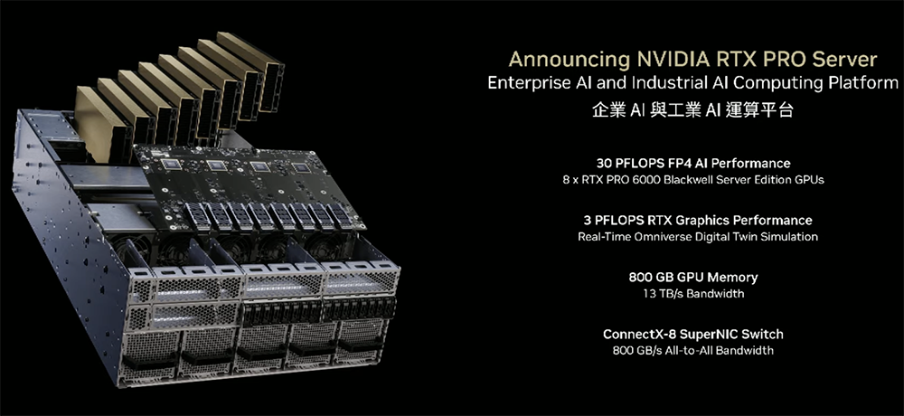 这些新服务器将提供多种NVIDIA认证系统配置,针对英伟达AI软件栈、Spectrum-X以太网网络进行了优化,最多科支持8张RTX PRO 6000 Blackwell服务器版GPU,FP4 AI性能可达30PFLOPS,3PFLOPS RTX图形性能可支持大规模实时Omniverse数字孪生模拟和工业机器人等物理AI应用。