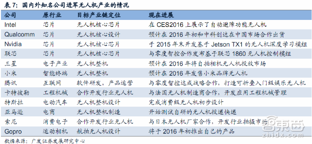 目前芯片业界三大巨头:高通/Intel/Nvidia都纷纷挺进这一产业,推出以自己的移动芯片或图形计算芯片为核心的无人机参考设计或套件;此外中国芯片设计厂商联芯科技也与中国无人机厂商零度智控联合开发了用于智能无人机的方案。