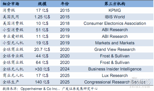 1.美国金融服务机构Oppenheimer总结了一些第三方研究机构对无人机市场现状与未来的预测,虽然以上统计和预测有一些相互矛盾的地方,但总体上对这一市场偏乐观的观点居多。